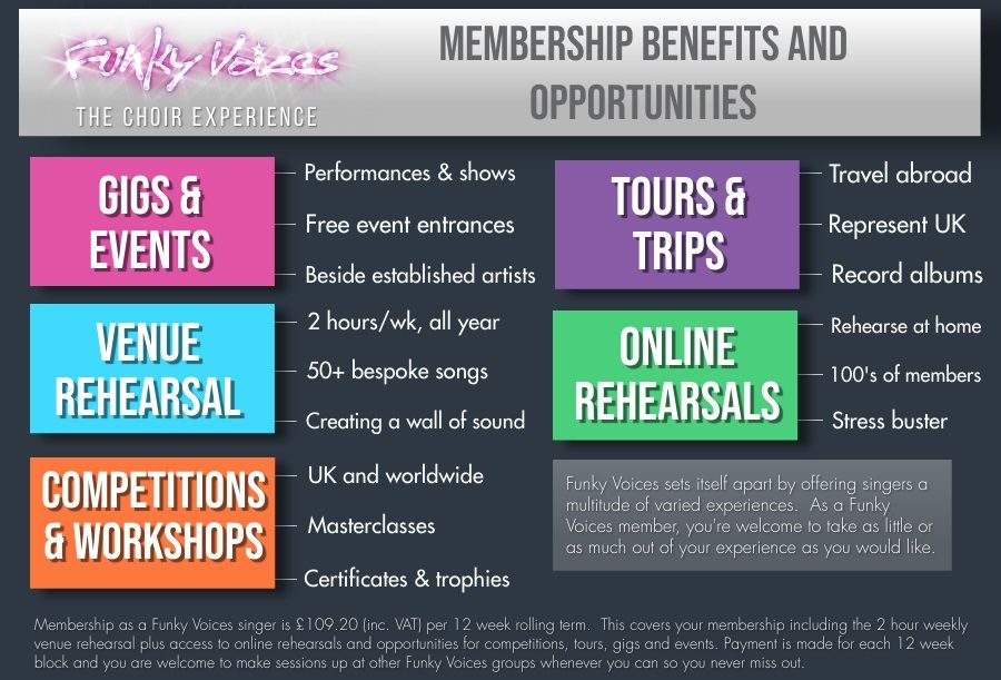 Membership as a Funky Voices singer is £109.20 (inc. VAT) per 12 week rolling term. This covers your membership as a Funky Voices singer including the 2 hour weekly venue rehearsal plus access to online rehearsals and opportunities for competitions, tours, gigs and performing with free entry to many events .